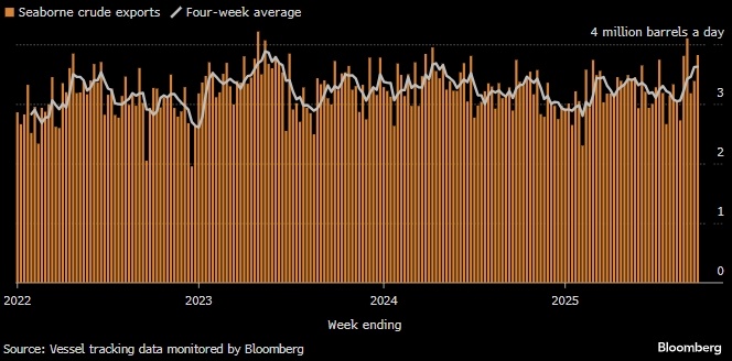 Согласно данным отслеживания судов, собранным агентством Bloomberg, средние поставки из портов страны за четыре недели до 28 сентября составили 3,62 млн баррелей в день, что соответствует самому высокому показателю с мая 2024 года. Среднее значение дает более четкое представление об основных тенденциях, чем более волатильные недельные показатели.