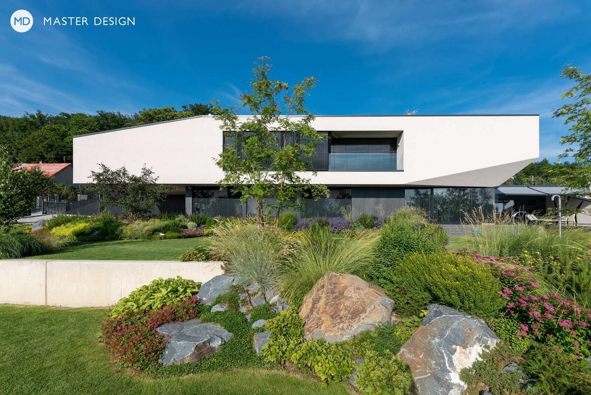 Роскошная белая вилла, гармонично вписанная в склон, расположена на холме над городом Оломоуц. Отсюда открываются поистине непревзойденные виды на Литовельский ручей и Гану, а прямоугольный участок имеет юго-западный уклон, благодаря чему он приятно ориентирован к солнцу. Пожеланием заказчиков было построить дом на большом участке, который, учитывая расположение на склоне, обеспечивал бы достаточную приватность для террасы с бассейном. Вид на ландшафт сыграл важную роль. Массив дома с одной стороны естественным образом вырастает из склона и с улицы выглядит как одноэтажный дом. Этаж поднимается в сад, эффект его массивности подчёркивается остеклённым первым этажом. Таким образом, дом своей массой создаёт надёжный барьер и позволяет свободно перемещаться между террасой и гостиной в полной уединённости. Функционально дом разделён на две части, так что каждый этаж может использоваться как отдельное помещение. На первом этаже расположены гараж, гостевая квартира и кладовая на открытом во