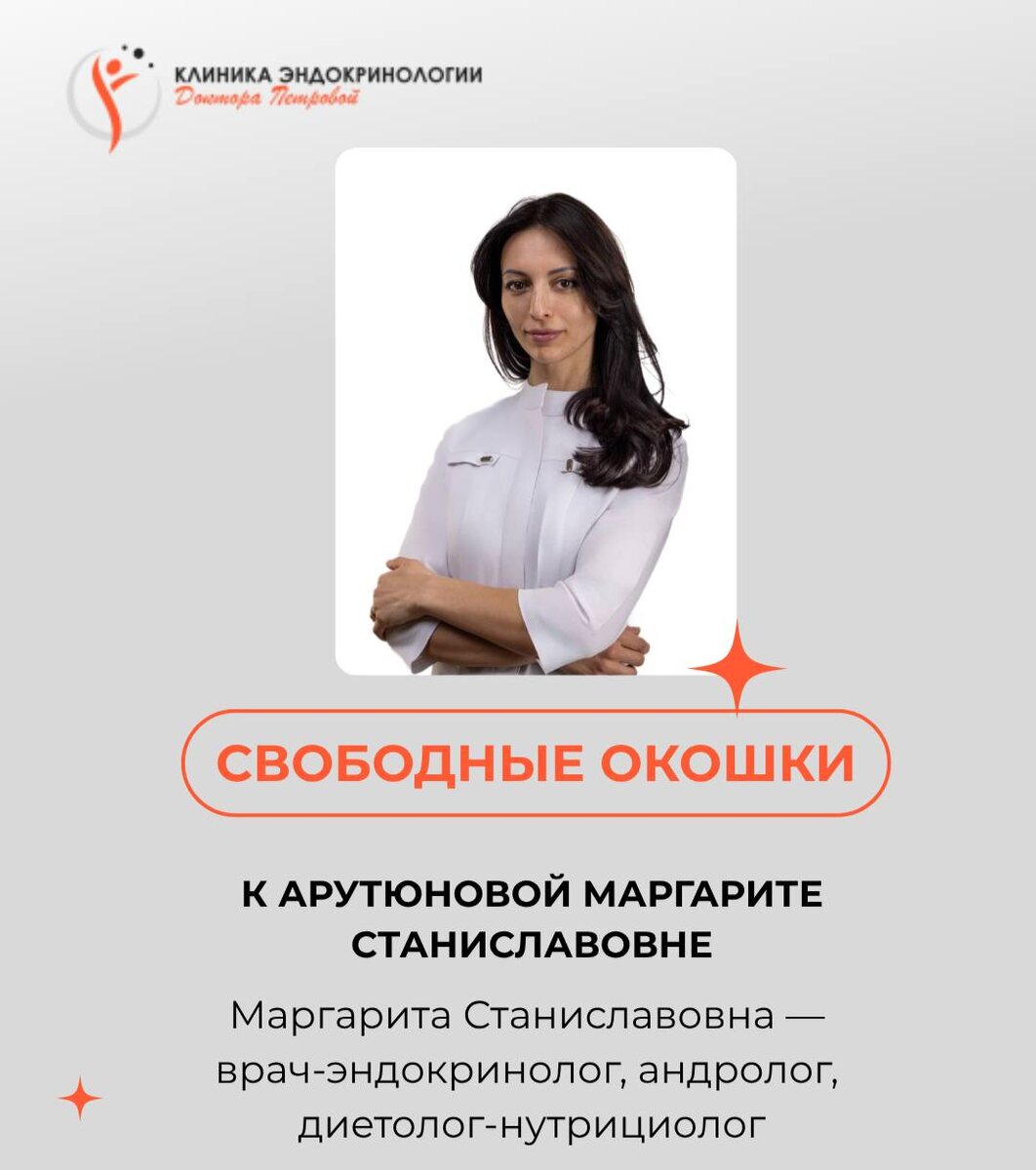 ОКОШКИ НА КОНСУЛЬТАЦИИ 📌к Арутюновой Маргарите Станиславовне в октябре 7 октября (вторник) ⏰11:00 13:00 14 октября (вторник)⏰ 12:00 14:00 На приеме вы детально обсудите с Маргаритой Станиславовной ваш вопрос, доктор изучит анализы, составит план достижения хорошего самочувствия. На консультации вы также можете выполнить ➡️биоимпедансный анализ состава тела на системе Medass 📱 Если вы в другом городе — есть онлайн-формат : удаленная консультация в Зум или What’s app Записаться можно по ссылке 👇🏼 https://api.whatsapp.com/send?phone=79151603876