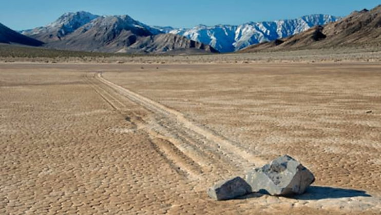 Эти камни в Долине Смерти (Калифорния) ведут себя так, будто нарушают законы природы. На высохшем озере Рейстрек-Плайя валуны, порой весьма внушительных размеров, оставляют за собой длинные следы, словно кто-то невидимый толкает их по глинистой равнине. Эти следы, тянущиеся иногда на сотни метров, изгибаются, пересекаются, а то и резко меняют направление, веками ставили в тупик даже учёных. Камни реально двигались, но никто не видел, как, что породило кучу мистических теорий. Даже первые научные гипотезы звучали как фантастика, доходило и до инопланетян. Но в основном подозревали ветер. Например, пылевые вихри — мини-торнадо, которые носятся по Долине Смерти, поднимая песок. В 1952 году эту теорию геологи решили проверить. Залили участок дна водой, чтобы размягчить глину, и направили на него мощный поток воздуха от самолётного пропеллера, имитируя ураганный ветер. Камни, однако, с места не сдвинулись, а эксперимент оставил больше вопросов, чем ответов. Ветер, даже самый яростный, не мо