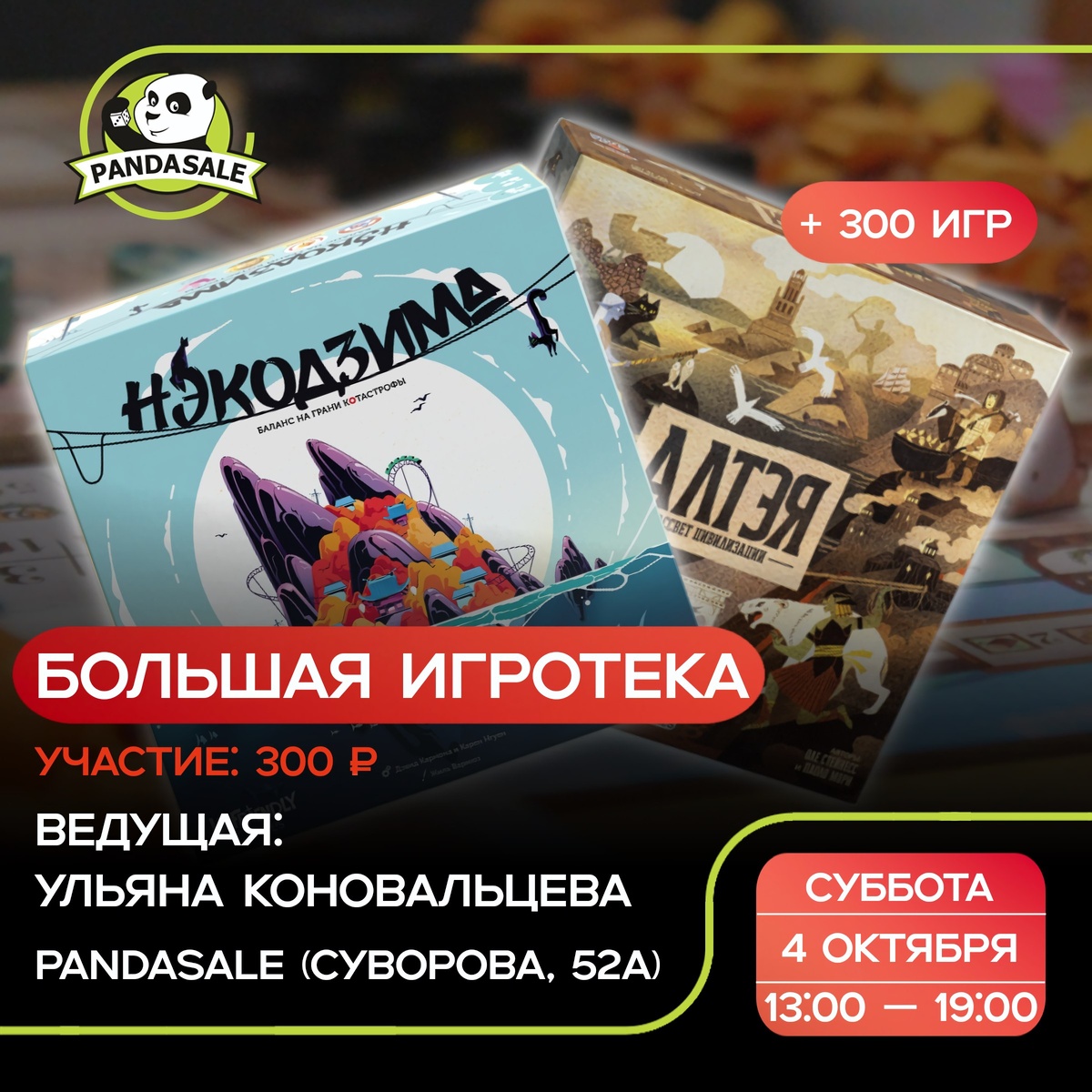 💥 Приглашаем на БОЛЬШУЮ игротеку, которая пройдет 4 октября. Сделайте свою субботу незабываемой! 📍 Где: Суворова 52а ⏰️ Во сколько: с 13:00 до 19:00 😀 Ведущая: Ульяна Коновальцева ➕ Участие: 300 рублей 🎮 Игры, в которые научим играть: 🐼 13:00 — Алтэя. Рассвет Цивилизации Алтэя. Рассвет Цивилизации — стратегия про борьбу народов за мифическую страну, где древние магические племена и люди сталкиваются за земли, ресурсы и влияние. Вы собираете колоду, захватываете территории, строите поселения и развиваете технологии, выбирая свой путь к победе — силой, прогрессом или культурой. Зацепит высокой интерактивностью, простым входом при глубокой тактике и яркой атмосферой с ощущением настоящего цивилизационного противостояния. • Всего 4 места. Запись в комментариях. 😀 15:00 — Нэкодзима Нэкодзима — настольная игра про ловкость, баланс и нервишки, где вы прокладываете «электросеть» на тесном островке, соединяя районы столбиками и верёвками по броскам кубиков. Башня растёт, становится вс