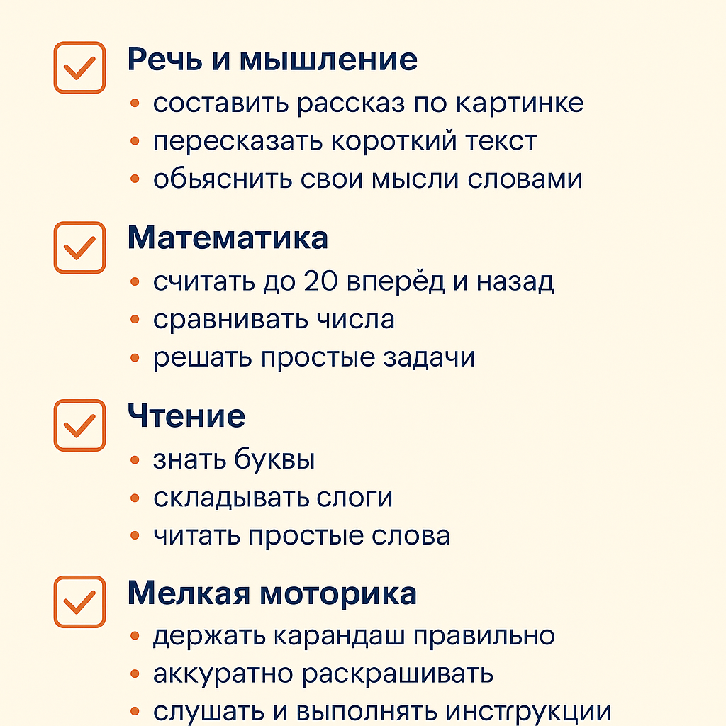 Многие родители думают, что к школе ребёнок должен только уметь читать и считать. На самом деле подготовка гораздо шире: важно, чтобы ребёнок пришёл в первый класс уверенным, самостоятельным и готовым к новым задачам. Что должен уметь будущий первоклассник: Речь и мышление – составить рассказ по картинке; – пересказать короткий текст; – объяснить свои мысли словами. Математика – считать до 20 вперёд и назад; – сравнивать числа («где больше, где меньше»); – решать простые задачи на сложение и вычитание. Чтение – знать буквы; – складывать слоги; – читать простые слова. Мелкая моторика – держать карандаш правильно; – аккуратно раскрашивать; – обводить и штриховать фигуры. Самостоятельность – собирать портфель; – переодеваться на физкультуру; – слушать и выполнять инструкции взрослого. Почему онлайн-подготовка удобна: – занятия дома — ребёнок чувствует себя спокойно; – интерактивные задания удерживают внимание; – педагог даёт обратную связь родителям и показывает, что ещё нужно подт