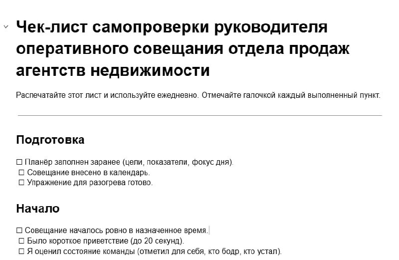 Чек-лист самопроверки руководителя оперативного совещания отдела продаж агентств недвижимости