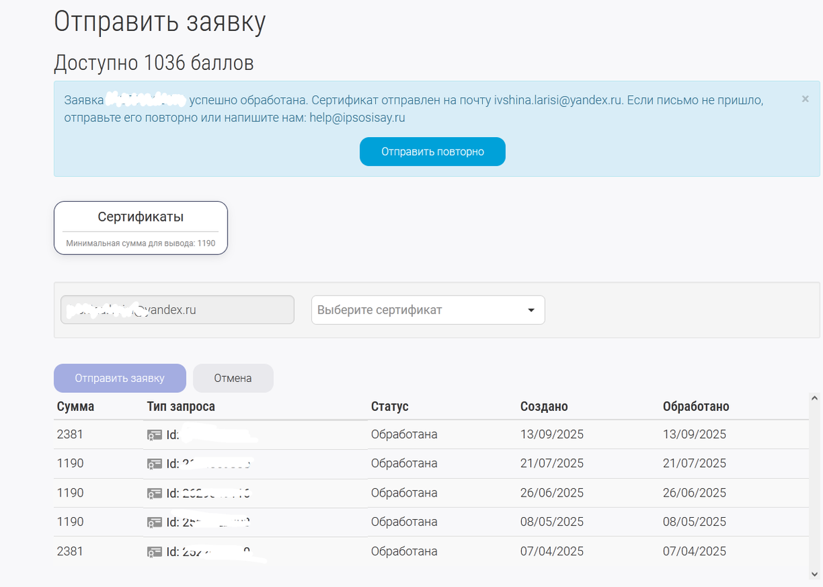 Как видите, я с апреля вывела 5 сертификатов, 2 на 1000 рублей и 3 на 500, плюс уже почти накопила на 6. Это 4000 рублей.