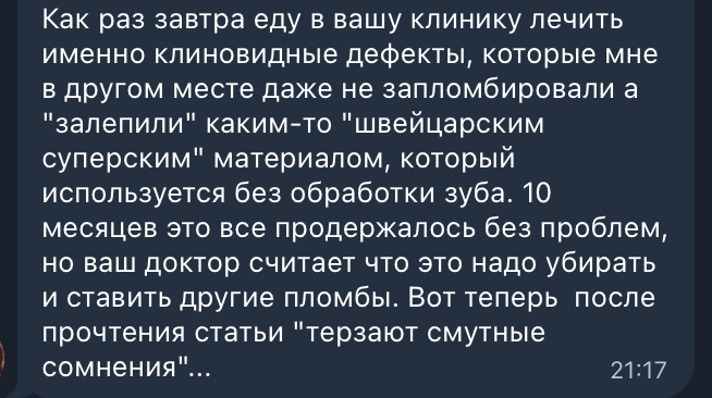 "Как раз завтра еду в вашу клинику лечить именно клиновидные дефекты, которые мне в другом месте даже не запломбировали, а "залепили" каким-то "швейцарским суперским" материалом, который используется без обработки зуба. 10 месяцев это всё продержалось без проблем, но ваш доктор считает что это надо убирать и ставить другие пломбы. Вот теперь после прочтения статьи '"терзают смутные сомнения'"..."
