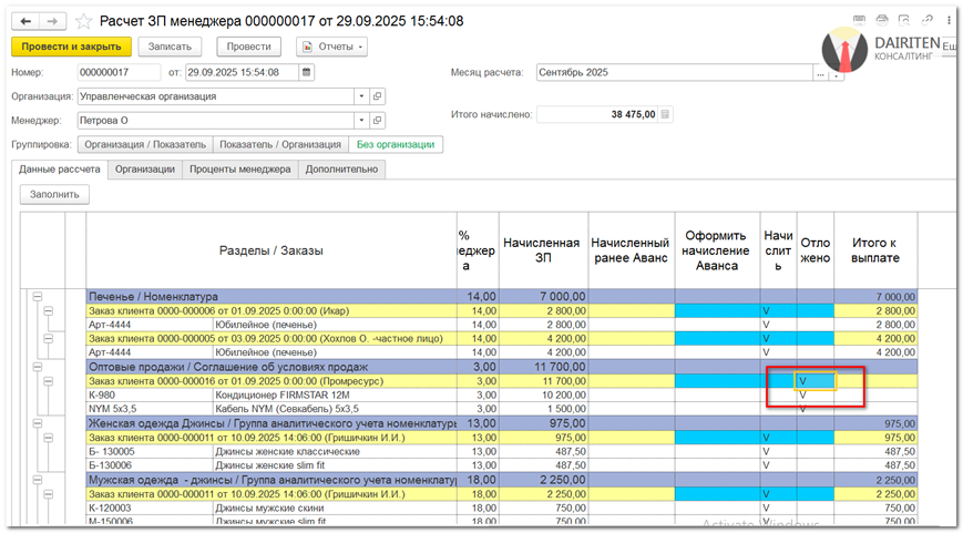 Как и обещала, рассказываю, как я управляю начислением процентов менеджеру с помощью расширения для 1 С. Видео для тех, кто не любит читать: Ситуация 1: Заказ закрыт, но мы не можем или не хотим в этом месяце выплачивать за него проценты. В колонке «Отложено» ставим галочку и сумма процентов пропадает из начисления к выплате. При этом в следующем месяце программа предложит доплатить за этот заказ и будет предлагать до тех пор пока мы не начислим проценты или не отменим начисление полностью. Ситуация 2: Заказ не закрыт, но менеджер не виноват, поэтому мы начислим ему проценты в этом месяце. В разделе незакрытые заказы в колонке Оформить начисление ставим сумму (можно всю, можно частично), сумма попадает в начисление к выплате. При этом, в том периоде, когда заказ закроется, в колонке Начисленный ранее аванс отразится уже выплаченная сумма. Ситуация 3: Не хотим выплачивать проценты менеджеру за Заказ! В колонке Оформить начисление аванса ставим сумму с минусом. WhatsApp: 7 926 138 8