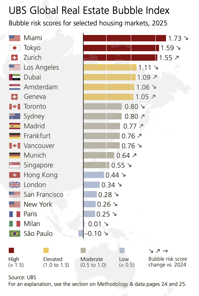 📌 На первом месте — Майами. Здесь индекс риска пузыря составил 1,73. За ним следуют Токио (1,59) и Цюрих (1,55). Эти города уже несколько лет подряд находятся в красной зоне.