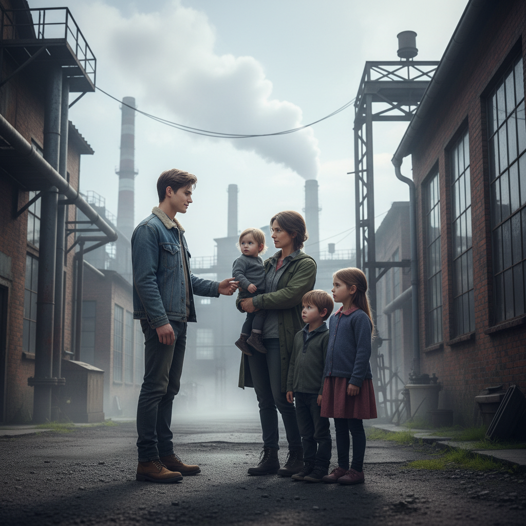Наступил вечер, когда вся семья собралась вместе. Заводские трубы дымятся вдали, но в доме Сидоровых царила гармония. Димка сидел рядом с Мариной, дети играли вокруг, а Игорь и Наталья улыбались, наблюдая за ними.