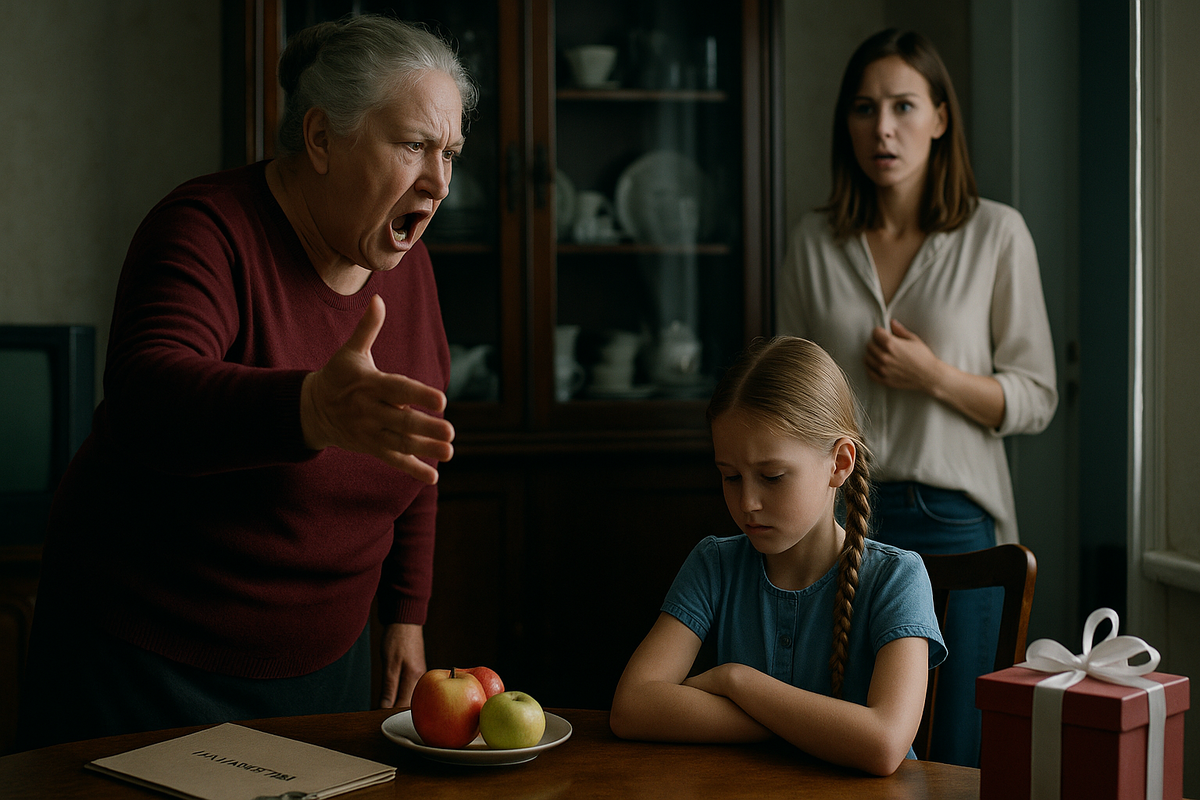— У меня только одна настоящая внучка, — громко рявкнула женщина. — А твоя страшилка не заслужила подарка!