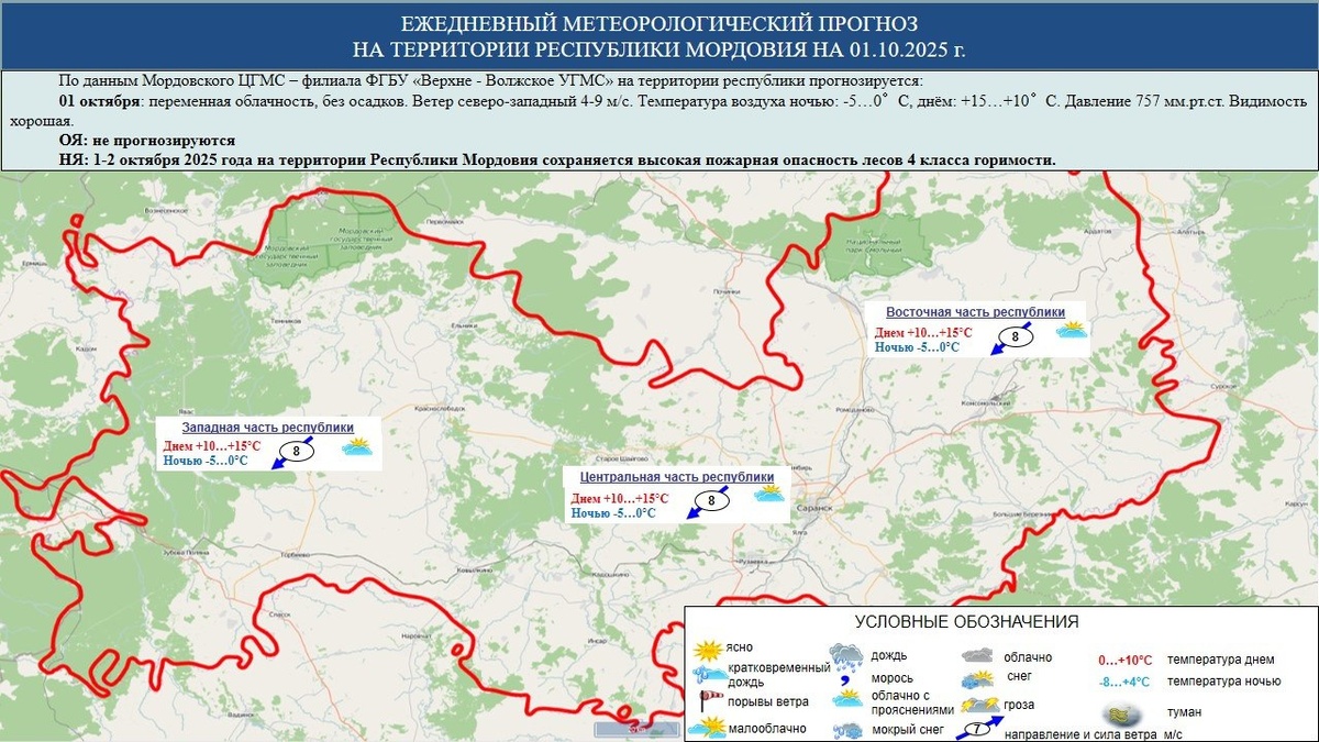 ☁️⛅⛈️ 1 октября в Мордовии переменная облачность, без осадков. Ветер северо-западный 4-9 м/с. Температура воздуха ночью: -5…0°С, днём: +15…+10°С. Давление 757 мм рт. ст. Происшествия | Подписаться | Предложить новость