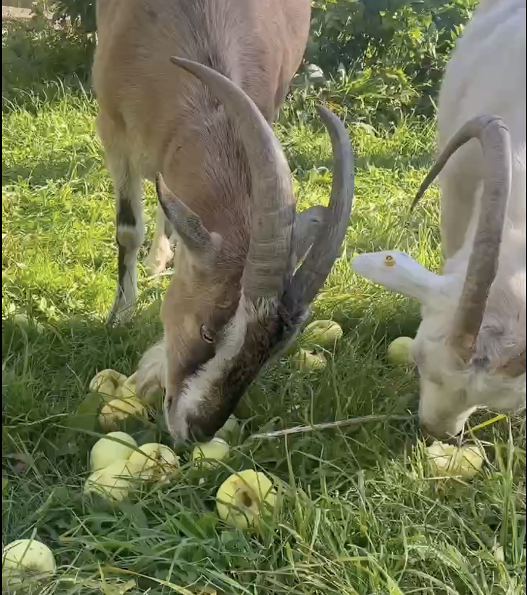 Угощала я тут на днях наших коз яблоками. Рассовала их по карманам и пошла убираться в леваду, зная, что козы сами на меня выйдут – поздороваться, пожелать доброго утра. Так и случилось. Первым, как обычно, подошел Рогалик, и я тут же вручила ему сочное яблоко. Он понюхал, откусил кусочек и потом засунул себе в рот почти целый фрукт (благо, что небольшой). А затем долго пытался хоть как-то поймать его (тот выскальзывал), не уронив, и начать жевать. Но справился, молодец! Все-таки это же Рогалик! Текила лежала возле своего домика и подходить не собиралась. Она себя не очень хорошо чувствовала, поэтому я сама принесла ей яблоки, от которых она весьма оживилась, но есть их продолжила лежа. Оничка тоже ко мне не вышел. Он, как всегда, стоял в домике коней и боялся – мира вокруг. И хотя обычно я так не делаю, но у меня было хорошее настроение, поэтому решила «обслужить» и этого козла – сама принесла ему красные яблоки. Он вытянул шею (робко-робко, чтобы при малейшей, с его точки зрения опас