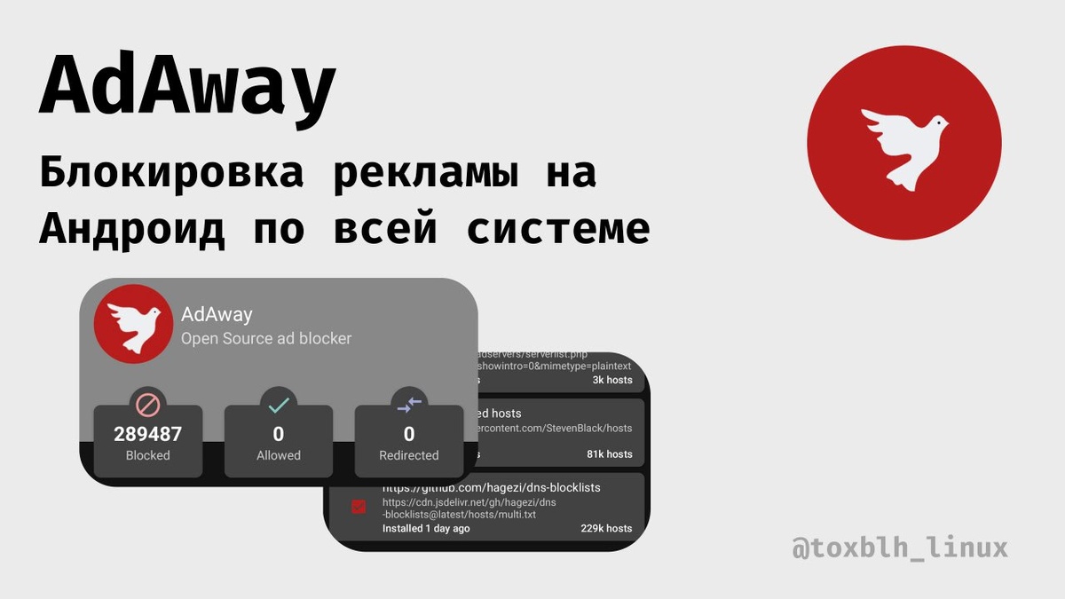 AdAway - блокировка любой рекламы на Андроид. Что это? Если коротко, это локальный PiHole. А что есть PiHole? Это свой DNS сервер с блокировкой рекламных хостов. То есть когда телефон пытается понять какой IP за ads.xxx.com условно, получает в ответ 0.0.0.0, а там уже никто и никогда не ответит, таким образом реклама просто не грузится по всей системе в любых приложениях. AdAway работает по разному в зависимости есть root или нет. У меня нет, так что работает, как VPN локальный, который заворачивает все DNS запросы на себя. Проект открытый: https://github.com/AdAway/AdAway Сайт: https://adaway.org/ F-Droid: https://f-droid.org/packages/org.adaway/ По умолчанию лист блокировки довольный скудный. Но подойдут любые листы хостов для PiHole. Свои любимые можете накидать в комментариях. Я нашёл этот большой лист DNS блока: https://github.com/hagezi/dns-blocklists Сам лист для добавления: https://cdn.jsdelivr.net/gh/hagezi/dns-blocklists@latest/hosts/multi.txt @toxblh