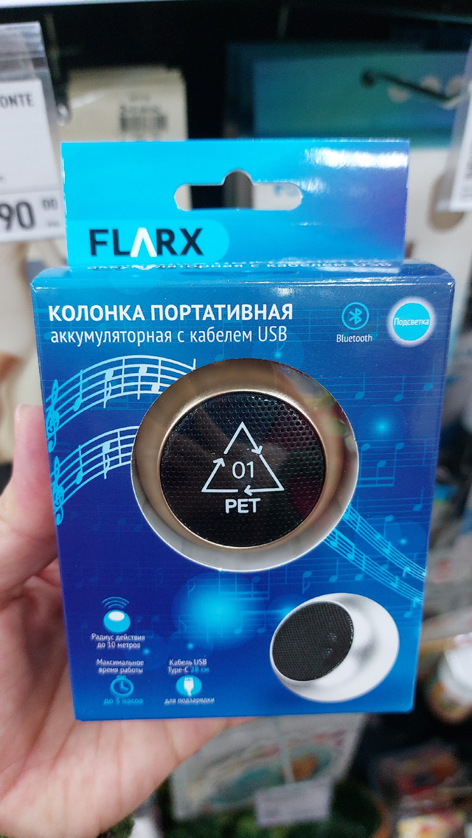 Обновили стенд и есть новинки. Портативная аккумуляторная колонка с кабелем USB, длина кабеля 28 см, с подсветкой, работает от блютуз, радиус действий до 10 м. Цена 385 рублей. Колонки трех цветов: золотая, серебряная и черная. Время работы от полного заряда до 3 часов, заряжается примерно 2 часа. Продается в коробке.