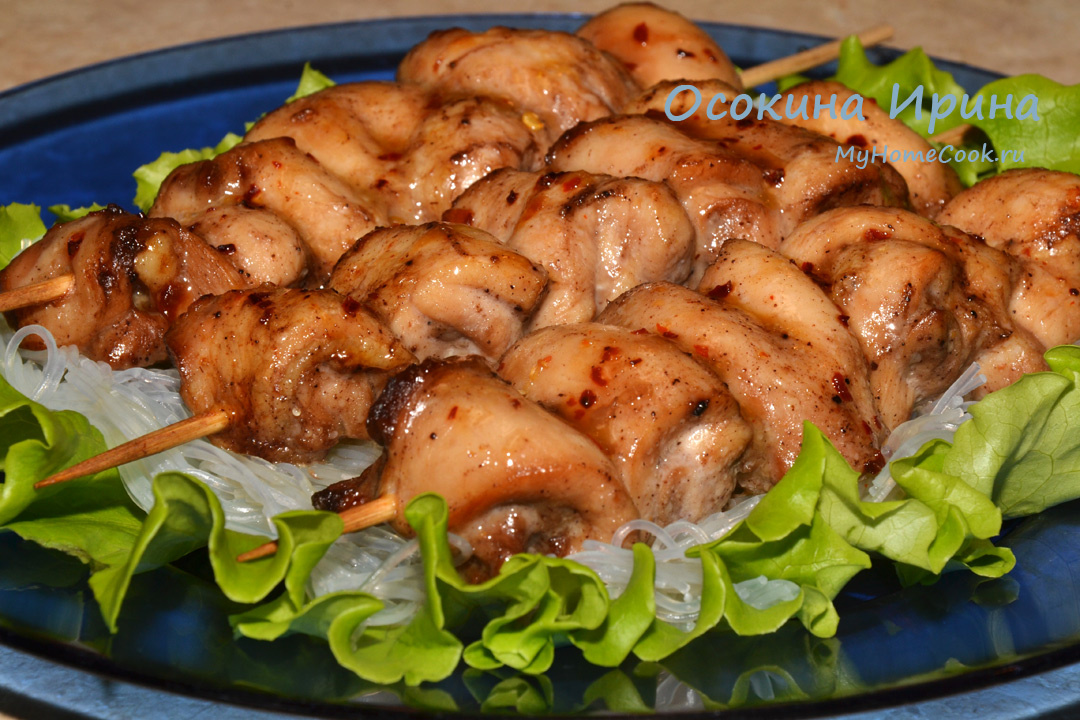 Вчера в миске смешала 3 - 4 ст.л. соевого соуса, 1 ст.л. кунжутного масла, 1 ст.л. лимонного сока, 1 ч.л. смеси "5 специй" и соль по вкусу, добавила 700 г филе куриных бёдрышек средними кусочками и убрала в холодильник. Сегодня нанизала курицу на заранее замоченные в воде деревянные шпажки, уложила в смазанную маслом форму, сбрызнула оливковым маслом и запекла в духовке, разогретой до 180 градусов, в течение 20 минут. В пиалке смешала 1 ст.л. мёда, 2 ст.л. яблочного уксуса и 1/2 ч.л. хлопьев чили, промешала до однородности, полила этим шашлычки и вернула в духовку ещё на 10 минут, достала форму, накрыла фольгой дала шашлычкам "отдохнуть" немного и подала с фунчозой. Очень вкусно получилось) Приятного аппетита