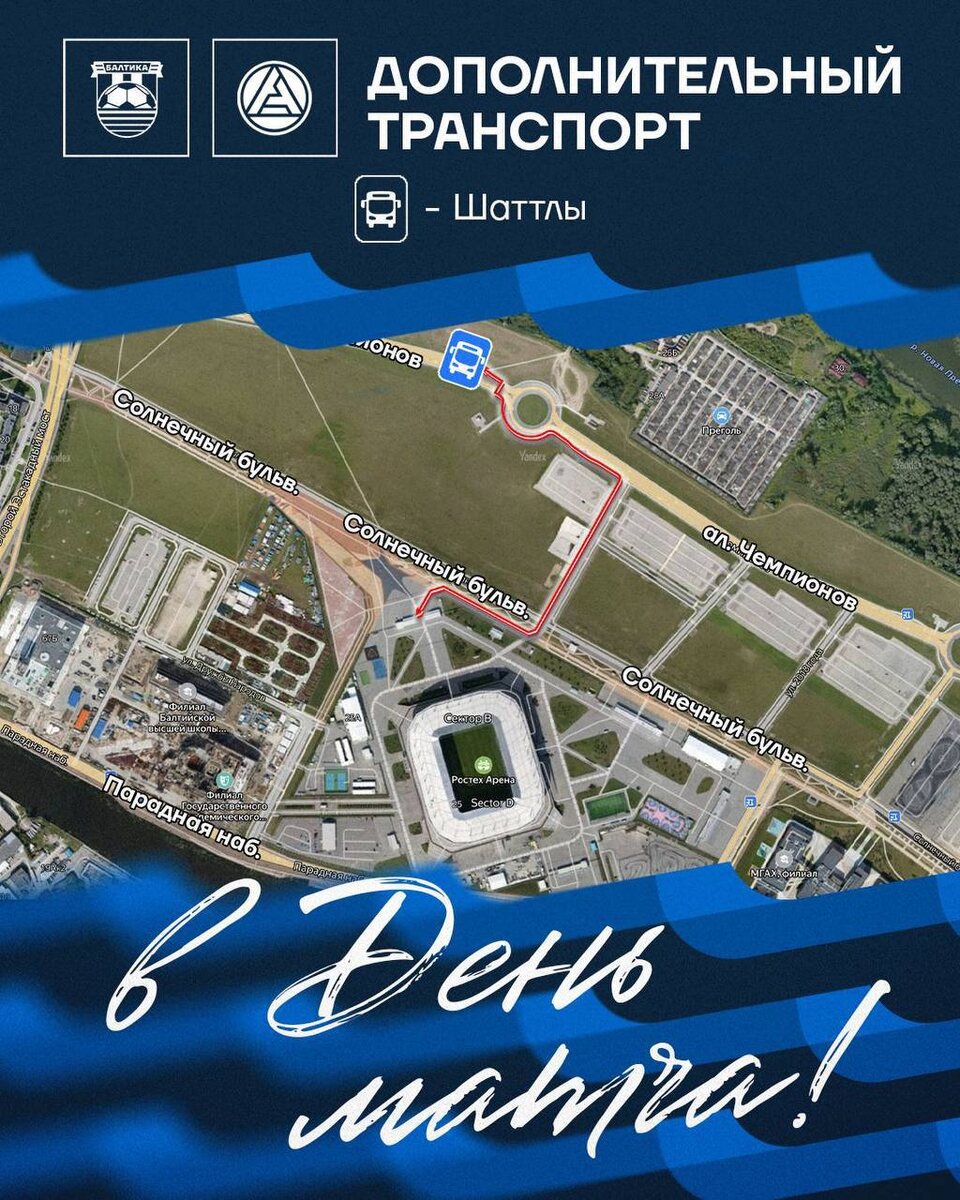 ШАТТЛЫ В ДЕНЬ МАТЧА 💙 Для вашего удобства после матча «Балтика» – «Акрон» будут организованы шаттлы от «Ростех Арены» до Южного и Северного вокзалов. С остановки от стадиона (см.на схеме) автобусы будут готовы отправиться в 21:45 (по мере заполнения).
