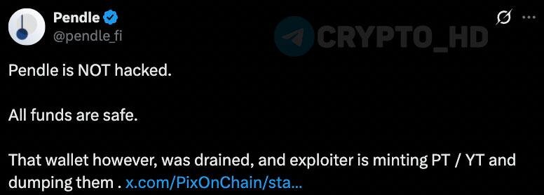 #взлом 🚫 #PENDLE Хакеры взломали Pendle? Сегодня появились слухи о возможном взломе Pendle. Что случилось на самом деле: ➠ Протокол не взломан – смарт-контракты работают нормально, средства пользователей в безопасности. ➠ Скомпрометирован отдельный кошелек кита (EOA), а не сам контракт. ➠ Через этот адрес злоумышленник минтил PT и YT токены (части депозита и доходности) и сливал их на рынок. ➠ На новостях просел только PENDLE, а курс pUSDE остался стабильным. ➠ Итог: паниковать не стоит, инфраструктура Pendle в порядке. Crypto Headlines