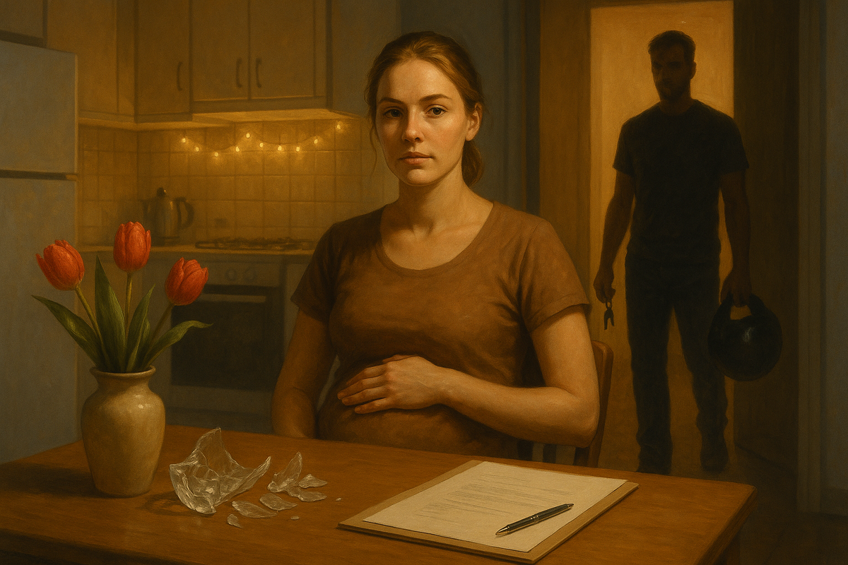 В ту же ночь он ушёл в гараж «проветрить голову». Я лёгла на диван, включила «белый шум» и вдруг услышала, как под «шум» сложилась картинка: мотоцикл — кредит — гараж — выходные с «пацанами» — «потом». И где-то с краю — я с животом, в поликлинике, в очередях, в тишине. Ваза на полке блеснула гранями.