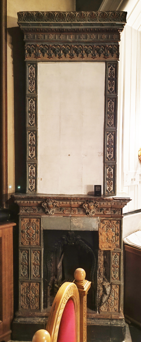 Что-то тут не так. Не могут серийные изразцы, которые производят в стандартных формах настолько отличаться друг от друга. Никто не лепит эти узоры вручную листик за листиком. Точнее скульптор-то лепит, конечно, но из пластилина и только один раз. Потом с модели, созданной скульптором, снимается рабочая форма, а при помощи этой формы можно изготовить из глины хоть сто тысяч одинаковых изразцов. Каждый, кто в детстве пользовался формочками для песка имеет довольно точное представление о том, как тиражируются подобные вещи. И каждый, кто лупил совочком по формочке, чтобы она снялась с песочной машинки понимает, что машинка из формочки всегда получается одна и та же. Не может такого быть, чтобы у одной окошко было побольше, а у другой поменьше. У одной 2 колеса, а у другой 3. Нет. Они как клоны неразличимо идентичны друг другу. А тут все какое-то не такое. А еще на изразцах каминной полки какие-то внезапные картуши:
