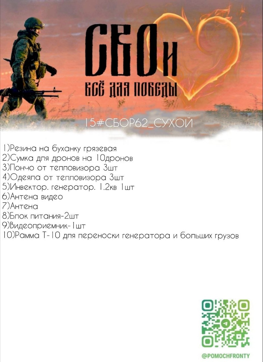 1️⃣5️⃣ый Октябрьский сбор 🚨 😶😶😶😶😶 🎯 СУХОЙ. ПОКРОВСК. 114-я бригада. Были ПТУР — теперь БПЛА Легендарная 114-я бригада перевооружается: теперь работают с дронами. Поможем им оставаться мобильными, скрытными и эффективными! Нужно для дела: • Резина грязевая на «буханку» • Сумка для 10 дронов • Пончо и одеяла от тепловизора (по 3 шт) • Генератор инверторный 1.2 кВт • Антенны видео и связи • Блоки питания (2 шт) + видеоприёмник • Тележка RAMMA T-10 для перевозки генератора Это не просто вещи — это мобильность, маскировка и связь!