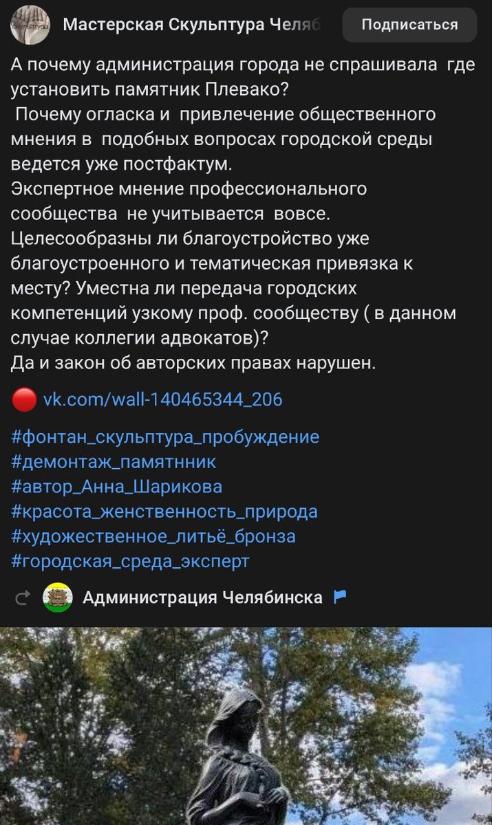 Администрация Челябинска решила провести опрос куда же поставить девушку, которая неплохо стояла в сквере у Урала. На что задается закономерным вопросом скульптор, которая, в свое время, и делала скульптуру "Пробуждение". Действительно, почему горожан не спрашивали, хотят ли они благоустраивать уже благоустроенный сквер и менять скульптуру красивой девушки на памятник мужика-юриста, который в свое время прославился в Москве своим ораторством? Плевако неплохо бы смотрелся в другом сквере, где действительно требуется благоустройство. А благоустройство текущего сквера так многие и не понимают ЗАЧЕМ? Что стало лучше? Поменяли одни качели на другие и заменили скульптуру, вот и все благоустройство. Куда делись старые качели или про них тоже будем проводить опрос куда их ставить? Зачем их вообще нужно было демонтировать? Ведь на их появление в целом повлияло общество и это было отличным примером взаимодействия жителей и администрации города, такое ценить надо. Наше мнение: поставьте скула