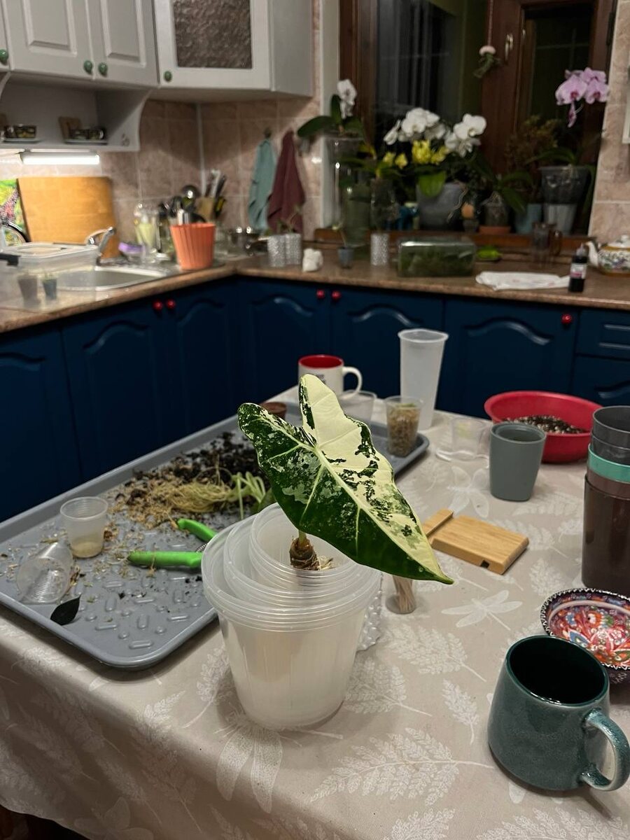 Занималась вчера в ночи пересадками, все алоказии уехали в лечузу на фитиль🥰 Из интересного: 1. Мамка Фрайдек все это время держалась на 2 корнях💀Разветвленных, но 2 Все остальное место в горшке заняли детки и клубни. Да, вот этот клубень с длиннющим корнем и носиком - ее ребенок 2. Не делайте как Аня (даже если сильно лень), не кидайте несколько клубней в один стакан с мхом, если планируете их рассаживать😄 Алоказии Мело и мишольца качественно сплелись, так что меня ждал квест по распутыванию. Справилась успешно, хотя можно было не страдать, и просто сделать нормально сразу🔥 3. Длинноногим алоказиям тоже досталось. Больше всего я мучала Жаклин. Полтора часа размачивала корневой ком, чтобы в итоге засорить раковину🤡 Из плюсов: достала ~20 клубней, так что ждите Жаклиновый дет сад 4. Пересадка новенькой Блек стем оказалась самой простой, но бесполезной. После переезда, она сбросила половину корней, так что просто обновила грунт, сняла клубни и ткнула в тот же горшок #aloca