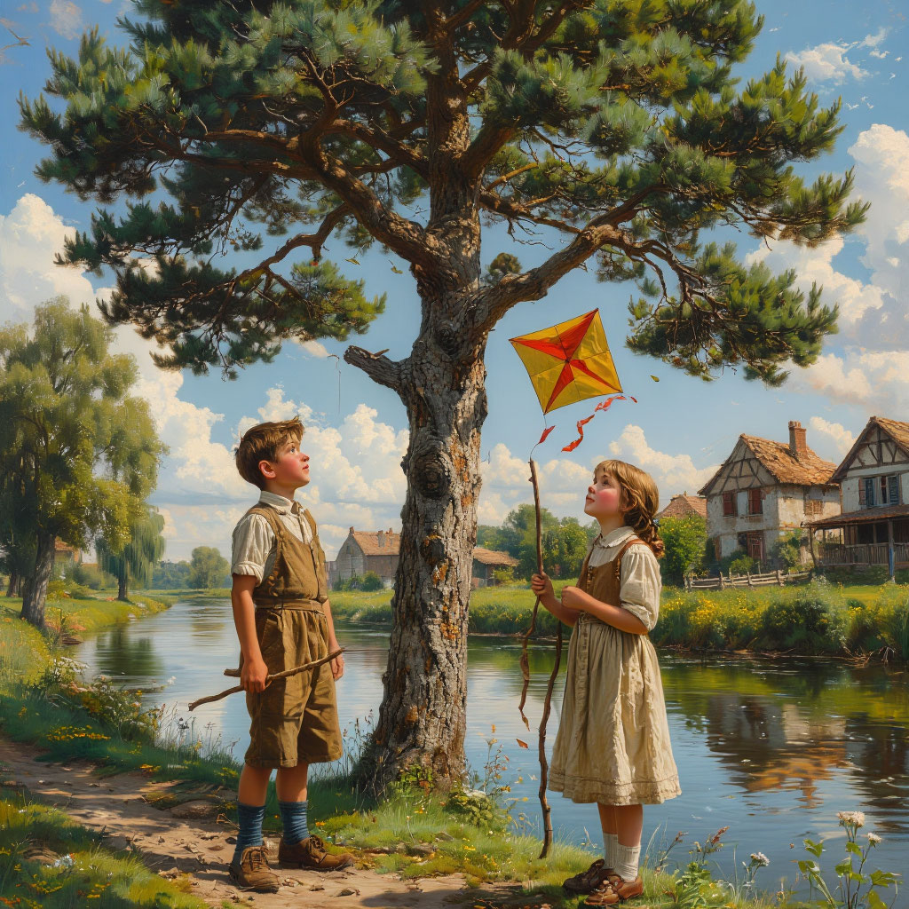 Саша, не теряя времени, побежала на лужайку. В руках у неё был новенький воздушный змей — подарок отца. Девочка с разбегу бросилась вперёд, и яркая игрушка, поймав ветер, устремилась ввысь. Ветер играл со змеем, унося его всё дальше от дома. Саша бежала, разматывая верёвку, смеясь и подпрыгивая от радости. Вдруг змей резко дёрнулся и исчез за кроной старого дерева у реки. Небольшое речное русло извивалось у подножия холма. Вода в нём была прозрачной, с зеленоватым оттенком. На берегу росли ивы, склонившие ветви к воде, словно любуясь своим отражением.