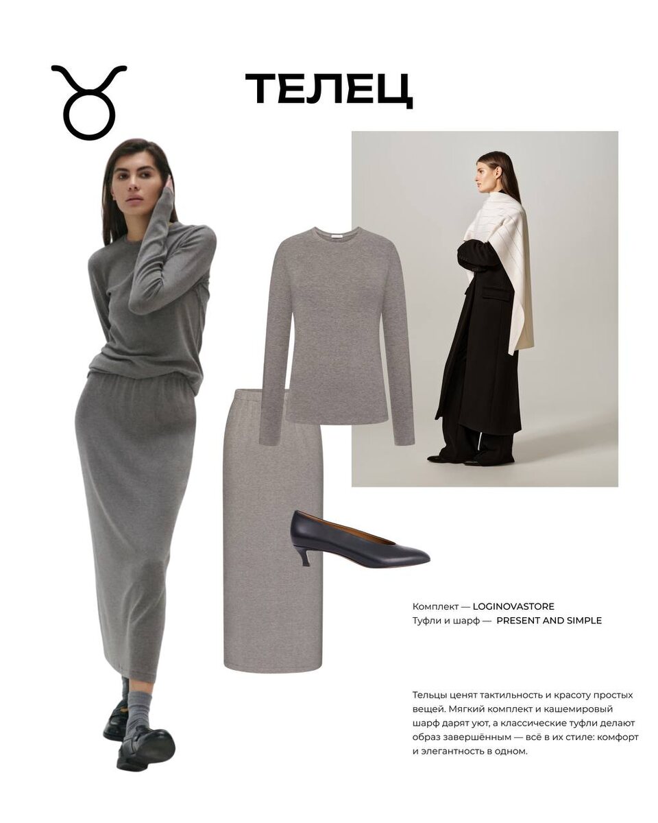 Модный гороскоп для земной стихии: Телец, Дева, Козерог ♉ Телец Тельцы ценят тактильность и красоту простых вещей. Мягкий комплект и кашемировый шарф дарят уют, а классические туфли делают образ завершённым — всё в их стиле: комфорт и элегантность в одном. ♍ Дева Вы всегда в поиске идеального баланса. Платье словно создано для вашей лаконичной точности, прямое шерстяное пальто выстраивает четкую линию силуэта, а туфли завершают образ. В вашем гардеробе нет случайностей — каждая деталь продумана до мелочей. ♑ Козерог Ваши образы говорят за вас: сила в структуре, уверенность в классике. Серый костюм подчеркивает деловой настрой, ботинки — максимально практичны, а сумка становится символом собранности и устойчивости образа. Это ваш способ показать миру: вершины достижимы. #ФокусМода_гороскоп