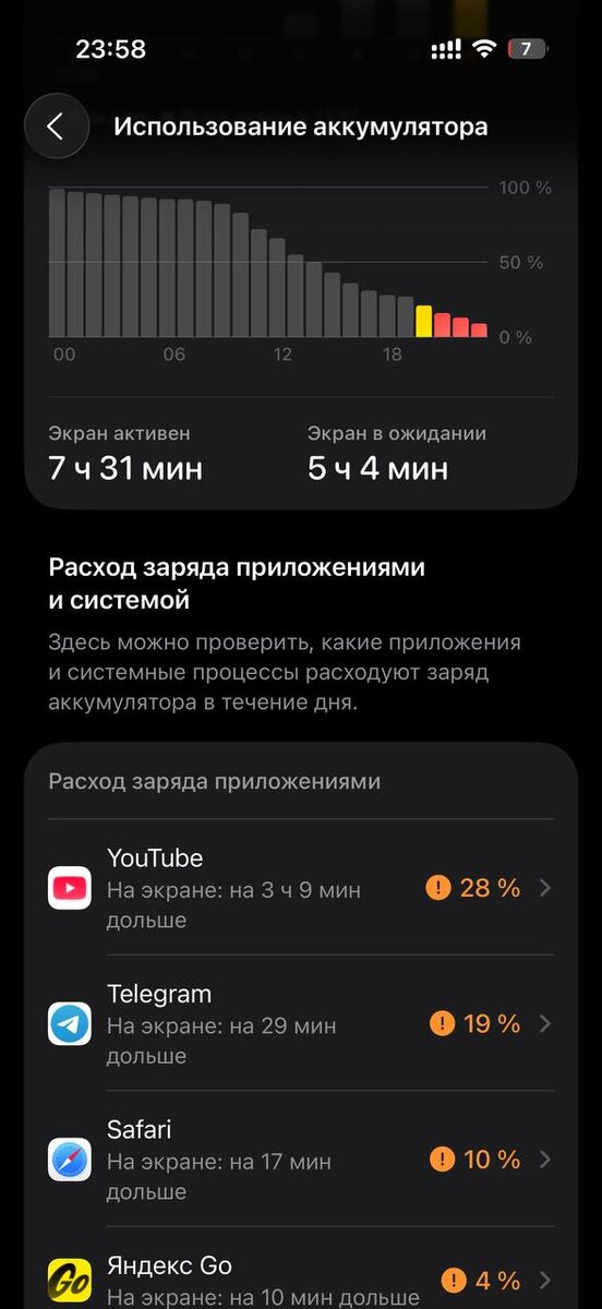 В ответ на пост ⚡️Автономность iOS 26.0.1 Снял с зарядки в 21:36 и активно пользовался до 01:00 ночи, а потом с 08:00. В итоге в 23:57 остается 7%. По условиям все стандартно для меня: LTE на двух симках, вайфай/сотовая сеть 20/80 по времени. Яркость 50%. Как обычно соцсети, браузер, ютуб, навигация. Айфон 17 Про, емкость аккума 100%. Always On и 120гц включены. В итоге около 8,5 часов экрана, все на график не влезло, но обратите внимание что почти все это время на сотовой сети и еще 7% остается, очень недурно! Как у вас?🤔