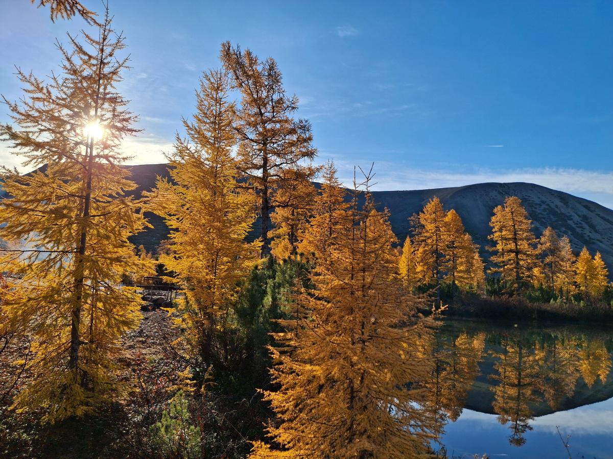 Еще в начале сентября у меня была небольшая рабочая поездка на Талую. Географически Талая находится на Охотско-Колымском водоразделе, на колымской стороне. Все реки и ручьи отсюда текут в Колыму. Здесь я первый раз в жизни попала в самый пик золотой осени! Такое случается не каждый год. Часто дожди и ветра быстро срывают воздушную хвою с лиственниц. Но в этом году в начале сентября стояла ясная тихая погода и мы в полной мере смогли насладиться насыщенными красками начинающегося увядания лиственничных лесов. В Магадане было еще лето, деревья стояли зеленые. На Охотской стороне водораздела, в верховьях реки Ола, осень только начинала вступать в свои права. Сверкали желтизной пойменные ивы, а лиственницы пока не сдались, зеленая хвоя у них преобладала. Листья чозении не обретают яркой окраски, их зелень просто постепенно блекнет, а вот тополя в сентябре пестреют желто-зеленой мозаикой. При подъеме на плато водораздела картина меняется - лиственницы наверху уже все пожелтели, а местами