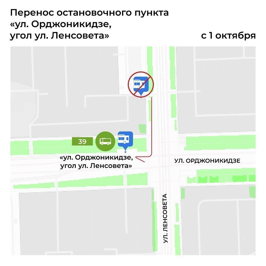 «С 1 октября остановка "ул. Орджоникидзе, угол ул. Ленсовета" переносится с улицы Ленсовета на улицу Орджоникидзе в обратном направлении на автобусном маршруте №39. Просим учитывать данную информацию при планировании маршрута», – говорится в сообщении.