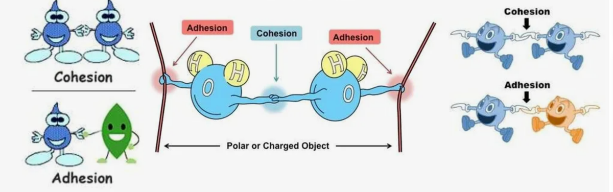 Почему вода собирается в капли? Как деревья поднимают влагу на десятки метров вверх? И каким образом насекомые удерживаются на гладких поверхностях? Всё это — проявления когезии и адгезии. Когезия — это притяжение молекул одного вещества друг к другу. У воды когезия особенно сильна благодаря водородным связям. Это объясняет многие удивительные явления. 🔹 Примеры когезии: Адгезия — это притяжение молекул одного вещества к молекулам другого. Вода легко прилипает к стеклу, клеточным стенкам растений, белкам. Именно это свойство объясняет капиллярный эффект. 🔹 Примеры адгезии: Адгезия и когезия — незаметные силы, которые делают возможной жизнь. Они удерживают воду в тканях, позволяют растениям питаться, а животным — выживать в самых разных условиях.