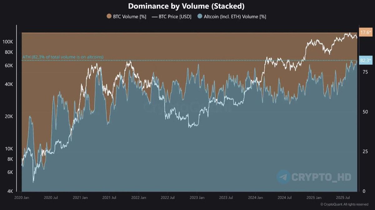 🤑 CryptoQuant: Альткоины заняли рекордные 82,3% рынка фьючерсной торговли на Binance.