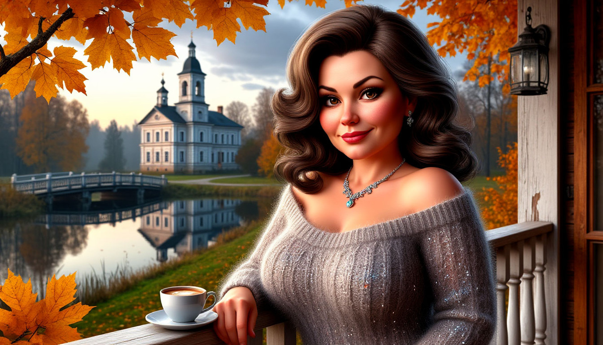 Перед нами открывается картина удивительной гармонии и красоты. Картинка изображает женщину средних лет, обладающую особым шармом зрелости. Это очаровательная бимбо-женщина, слегка полная брюнетка около сорока пяти лет, с каскадной стрижкой чуть ниже плеч. Ее лицо озарено нежной полуулыбкой, взгляд одновременно мечтательный и глубокий. Волосы аккуратно уложены, подчеркивая выразительные черты лица. Она одета в элегантный светло-серый свитер из мохера с блестящими стразами, открывающими плечи. Изящная опальная нить украшает шею, мягко переливаясь приглушенным светом. Женщина находится на втором этаже старинного поместья, выходящего на живописный пруд. Балкон просторный, огражден белыми балясинами, создающими ощущение спокойствия и умиротворенности. Поздняя осень окрашивает пейзаж вокруг золотистыми оттенками. Деревянный мост ведет к воде, над которой стелются легкие туманы. Сквозь сумрак вечернего заката виднеется силуэт колокольни, едва различимый сквозь дымку. Природа погружается в ти