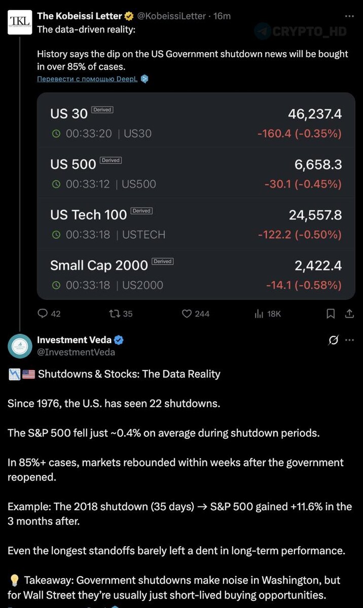 🇺🇸 Шатдаун ≠ кризис для рынков (twitter) С 1976 года в США была уже 21 остановка работы правительства. Итог для инвесторов – почти без потерь. В среднем S&P 500 снижался всего на 0,4%. В 85% случаев индекс быстро отрастал после открытия правительства. Даже после рекордного 35-дневного шатдауна в 2018 году рынок рванул вверх: +11,6% за три месяца. Для Уолл-стрит шатдаун – не катастрофа, а скорее шанс закупиться «со скидкой». Сегодня: Шатдаун в США Crypto Headlines