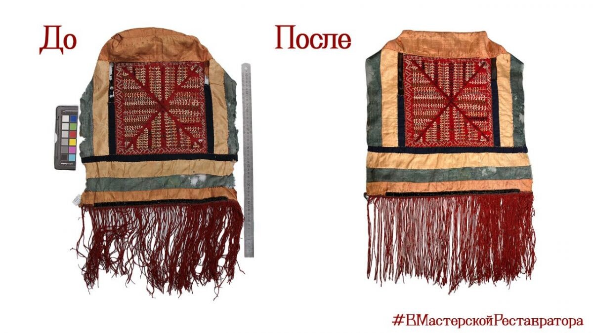 Вышивка выполнена в удивительной технике: двусторонний шов, благодаря которому дублируется рисунок с лицевой стороны и изнанке. Благодаря работе мастера внешний вид головного убора приблизился к первоначальному.
