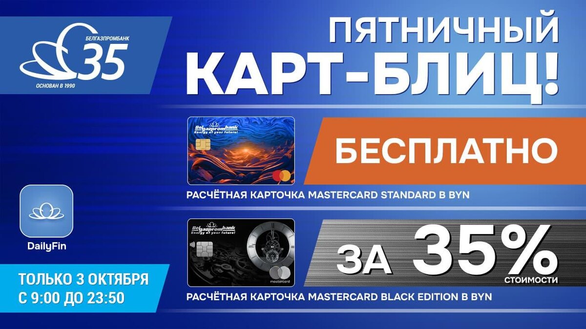 Время на принятие решения ограничено! Это предложение действует только 3 и 10 октября. Получите одну из самых популярных карт на особых условиях. Специально на эту пятницу мы подготовили новую серию карточек платежной системы Mastercard с невероятными условиями.3 октября расчетная карточка Mastercard Standard в белорусских рублях будет доступна за 0 руб. (вместо 15), а расчетная карточка Mastercard Black Edition в белорусских рублях в эту же пятницу – всего за 175 руб. (вместо 500)!Для справки:От ежедневных покупок до путешествий вашей мечты с картами Белгазпромбанка.Карта Mastercard Standard – удобный и безопасный инструмент, который помогает вам контролировать свои расходы. Преимущества карты включают возможность проводить операции за границей, оплачивать товары и услуги в торговых точках по всему миру, совершать операции онлайн не выходя из дома, снимать наличные в любом банкомате, а также пользоваться удобными онлайн-сервисами и мобильными приложениями для управления счетом и платежами.Но и это еще не всё. Что, если мы скажем, что карта Mastercard Standard позволит экономить на повседневных покупках? Получайте бонусы и привилегии в бонусной программе «Бусы», возвращая до 5 % от операции баллами. Mastercard Standard обеспечивает базовые, но функциональные возможности для повседневных расчетов с оптимальным соотношением цены и качества.Карта Mastercard Black Edition – это не просто платежный инструмент, а статусный аксессуар и ключ к закрытому миру премиальных услуг. Владелец карты получает все необходимое для комфортной жизни и путешествий. Привилегии обладателей Mastercard Black Edition:специальные скидки и предложения от платежной системы Mastercard, эксклюзивные бизнес-залы по программе Mastercard Lounge. Проходите в бизнес-залы аэропортов бесплатно, пока другие ждут свой рейс в общем зале;неограниченное количество посещений бизнес-залов в Национальном аэропорту Минск в рамках акции Mastercard;более чем 1 000 бизнес-залов в 400 аэропортах по всему миру (в 120 странах) по программе Lounge Key;быстрое и комфортное прохождение регистрации на рейс, пункта досмотра, посадки на рейс в Национальном аэропорту Минск по программе Fast track Mastercard;получение бонусов и привилегий в бонусной программе «Бусы»;карту со стильным черным дизайном приятно держать в руках и доставать из кошелька;мгновенные оповещения и максимальная защита ваших средств;возможность подключения карточки к платежным сервисам Samsung Pay, Mi Pay, Swoo Pay.Это не просто банковская карта. Это ваш пропуск в мир без границ и компромиссов.По многочисленным отзывам, условия первой пятницы были высоко оценены клиентами Белгазпромбанка. Мы уверены, что текущее предложение будет для вас не менее выгодным.Напомним, что акция ограничена по времени: оформить заявку на выпуск выбранной карточки в белорусских рублях с отметкой «Пятничный карт-блиц» можно в мобильном приложении DailyFin только в течение одного дня, 3 октября, с 9:00 до 23:50. Готовая карточка придет к вам по почте. Никаких походов в банк – только онлайн, все максимально просто, комфортно и, главное, выгодно!Не упустите возможность – присоединяйтесь ко второму раунду «Пятничного карт-блица»!«Пятничный карт-блиц» приурочен к 35-летию Белгазпромбанка. В течение трёх недель по пятницам вы можете дистанционно (в мобильном приложении DailyFin или интернет-банке) оформить одну из классических карточек бесплатно или одну из премиальны