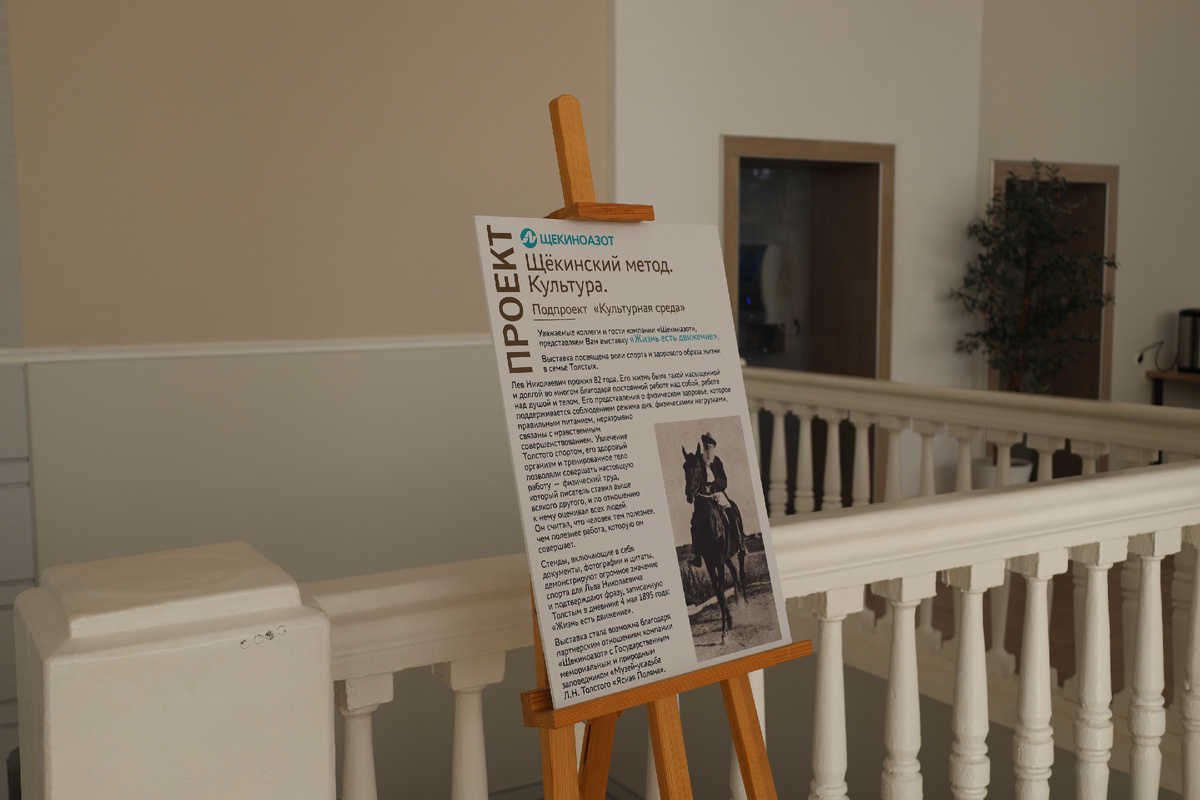 В холле столовой у центральной проходной обновили экспозицию в рамках проекта «Щекинский метод. Культура» и его подпроекта «Культурная среда». Выставка «Жизнь есть движение» посвящена роли спорта и здорового образа жизни в семье Толстых. Лев Николаевич прожил 82 года. Его жизнь была такой насыщенной и долгой во многом благодаря постоянной работе над душой и телом. Представления писателя о здоровье, которое поддерживается соблюдением режима дня, физическими нагрузками и правильным питанием, неразрывно связаны с нравственным совершенствованием. Увлечение Толстого спортом, его здоровый организм и тренированное тело позволяли совершать настоящую работу — физический труд, который писатель ставил выше всякого другого, и по отношению к нему оценивал всех людей. Он считал, что человек тем полезнее, чем полезнее работа, которую он совершает. Стенды, включающие в себя документы, фотографии и цитаты, демонстрируют огромное значение спорта для Льва Николаевича и подтверждают фразу, записанную Толс