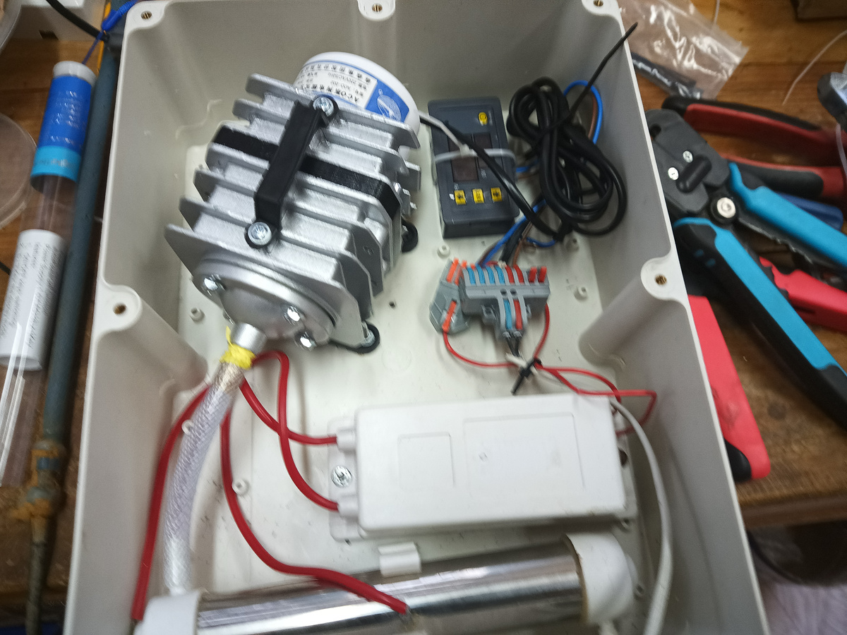 Решил изменить конструкцию самодельного озонатора. Теперь он выглядит так. Ручку с компрессора пришлось убрать, т.к. не закрывалась крышка. Розетка заменена на зажимы ваго и розетка таймер заменилась на цифровое реле (таймер) задержки времени со светодиодным дисплеем. Теперь все стало более компактным. Компрессор заменен на такой. Интересно, как таймер отработает с ЭДС нагрузкой. По настройкам таймера, необходим бесконечный цикл -включение 15 минут; -отдых 45 минут… и т.д. Для этого производим настройку P0-1 (минутный отсчет) Далее выбираем настройку P1-5 (режим вкл-выкл-вкл …) Для начала протестил на малых значениях времени - все работает. Т.е. при включении таймера сначала контакт замкнут на заданное время, потом размыкается и так до бесконечности. Понятно что через этот контакт подается питание на компрессор и озонатор. Минусы – компрессоры этого типа очень шумные, но это не критично, т.к. этот блок будет находится в теплице. Озонатор снова в строю. #очистка воды озоном #очистк