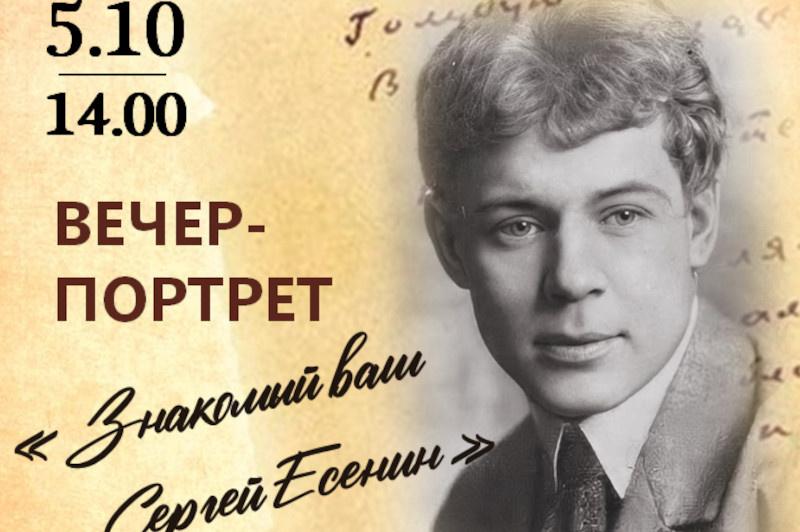 Вечер-портрет «Знакомый ваш Сергей Есенин» состоится 5 октября в 14:00 в гостиной библиотеки-филиала № 2 (пер. Московский, д.11). Вход свободный.
