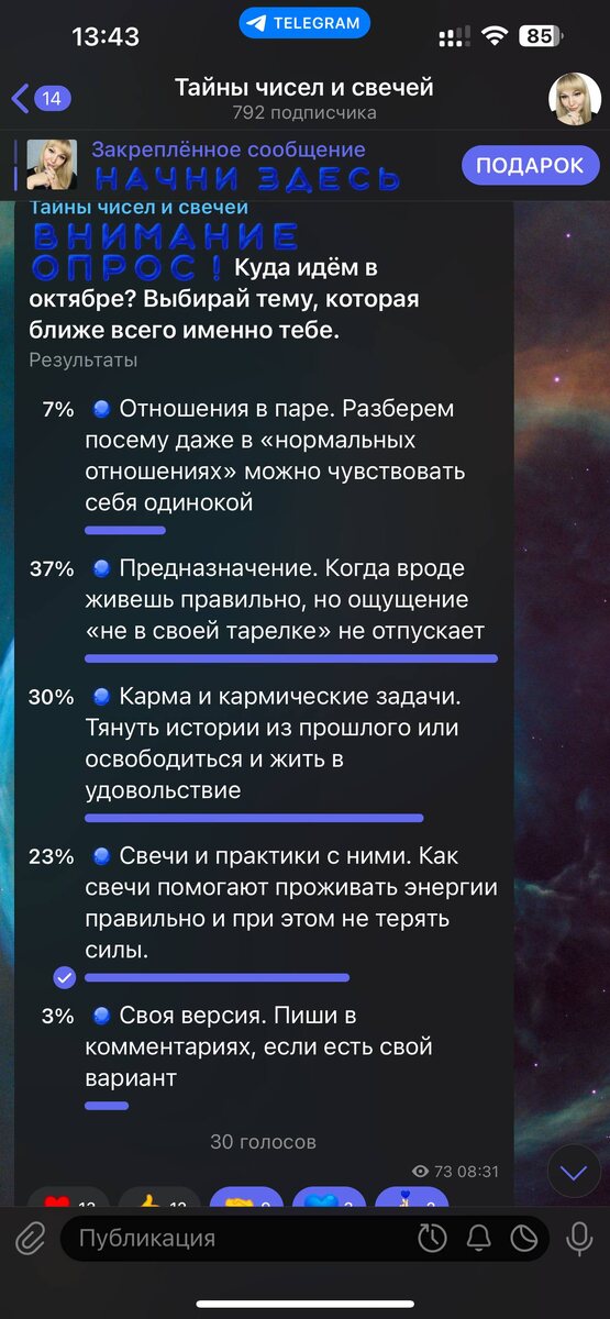 Выбор сделан… В сентябре я задала очень простой, но одновременно и очень сложный вопрос: «Что сейчас для тебя важнее всего разобрать?» Было несколько вариантов: одни хотели погрузится в карму, другие побольше узнать о свечах, но с небольшим перевесом выбор пал на Предназначение. Это многое объясняет. Сколько раз ты ловила себя на мысли: 🔵 вроде бы работаешь, но радости в этом ноль; 🔵 отношения есть, но будто что-то не так; 🔵 всё внешне нормально, а внутри сомнения и немой вопрос: «А моё ли это вообще?» Это и есть сигнал, что пора бы разобраться. Поэтому весь октябрь мы посвятим предназначению: ⏩️ как твоя дата рождения раскрывает миссию души; ⏩️ чем личное предназначение отличается от социального и духовного; ⏩️ какие ошибки чаще всего мешают реализовать свой путь; ⏩️ и что даёт ощущение того, что ты не на своем месте. Я покажу на примерах из практики, как понимание своей миссии меняет жизнь: работу, отношения и даже настроение с утра. Если у тебя внутри давно звучит