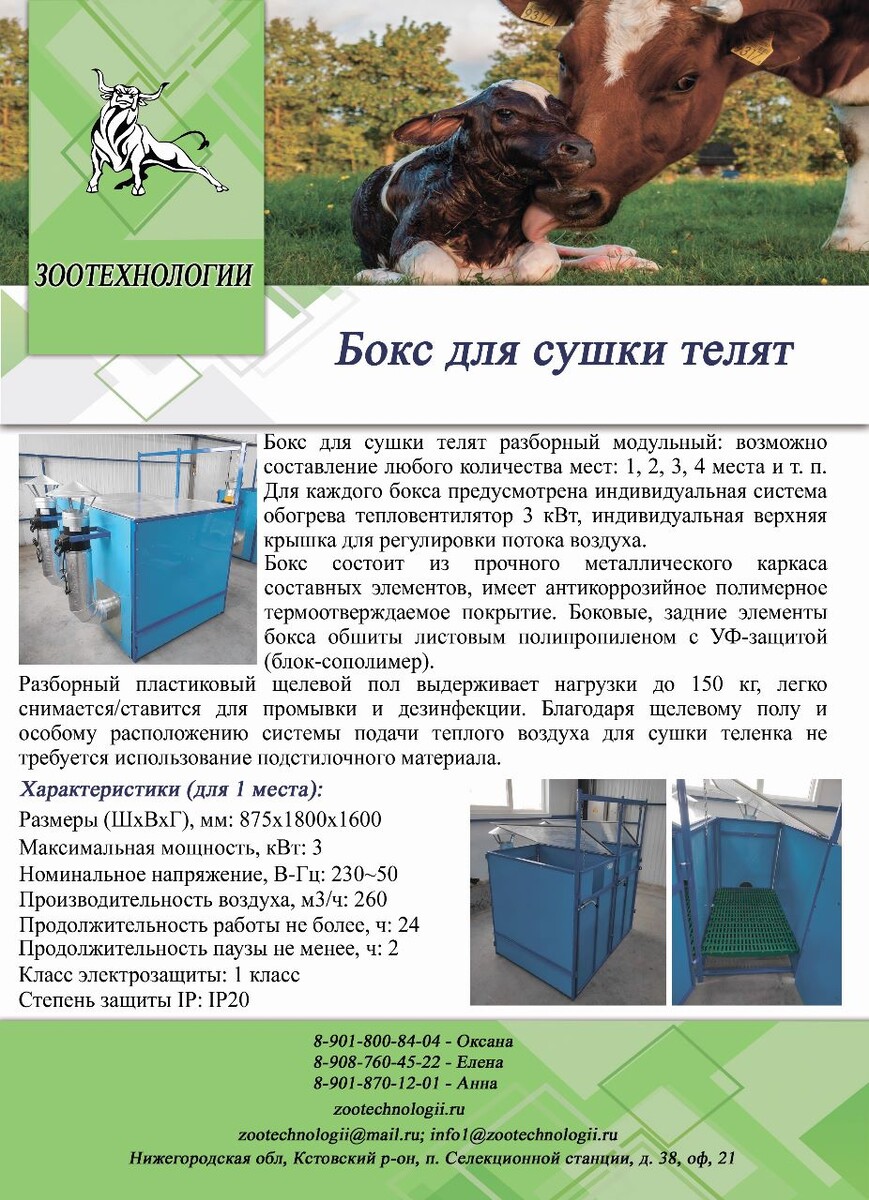 Бокс для сушки телят 💡 Предназначен для эффективного обсушивания новорожденных телят, предотвращая переохлаждение и снижая риск заболеваний. В первые часы жизни теленка температура его тела быстро снижается из-за потери тепла. В зимний период это особенно критично, так как переохлаждение приводит к ослаблению иммунитета и росту риска респираторных заболеваний. Бокс создает оптимальный температурно-влажностный режим, обеспечивая полное обсушивание теленка за 40–60 минут. ⛏ В конструкции предусмотрена тепловая пушка, равномерно прогревающая пол и частично воздух в боксе. Щелевой пол способствует естественной циркуляции воздуха, а крышка позволяет регулировать уровень нагрева в зависимости от сезона. Все вопросы Вы можете задать по телефонам: Елена Д.: 8-908-760-45-22 Оксана: 8-901-800-84-04 Анна: 8-901-870-12-01 Юлия: 8-908-742-37-86