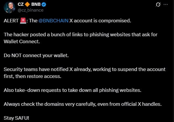 ❗️Соцсети BNB Chain взломаны: пользователям рассылают фишинговые ссылки Основатель Binance Чанпэн Чжао (CZ) сообщил о взломе официального аккаунта BNB Chain в соцсети X. По его словам, злоумышленники опубликовали несколько ссылок на фишинговые сайты, которые предлагают подключить криптокошелёк через WalletConnect. «Не подключайте свои кошельки. Наши команды безопасности уже уведомили X и работают над приостановкой работы аккаунта и восстановлением доступа», — написал Чжао. Он добавил, что параллельно поданы запросы на удаление всех мошеннических сайтов. CZ напомнил пользователям о необходимости внимательно проверять доменные имена даже в сообщениях с официальных аккаунтов: «Всегда будьте осторожны. Stay SAFU».