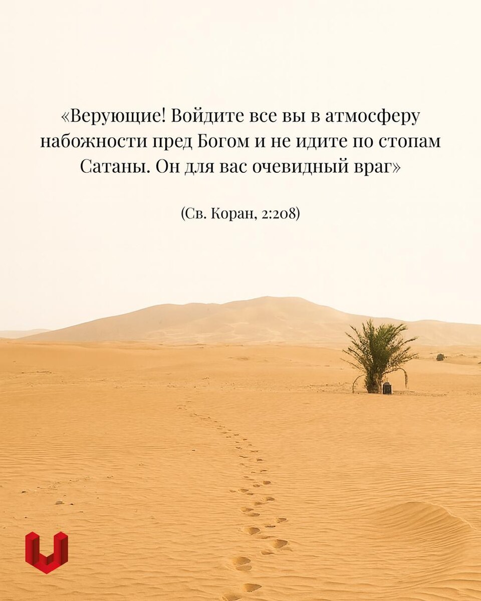 «Верующие! Войдите все вы в атмосферу набожности пред Богом (будьте сторонниками мира) и не идите по стопам Сатаны [не ходите его тропами; он провоцирует вас на конфликты, не дает возможности уступить другому и договориться]. Он для вас очевидный враг» (Св. Коран, 2:208). 📘 Богословский перевод Корана