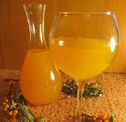 Ингредиенты: - 4 кг облепихи - 2,5 кг сахара - 4 л воды Приготовление: Ягоды переберите. Замороженные сначала разморозьте и промойте. Из ягод отожмите сок (его должно получиться 3 л), разведите его кипяченой водой, всыпьте 1 кг сахара, оставьте для брожения. Через 3 дня сок процедите, всыпьте оставшийся сахар и установите водяной затвор. По окончании брожения вино перелейте в бутылки, герметично их закупорьте и поставьте в прохладное место.