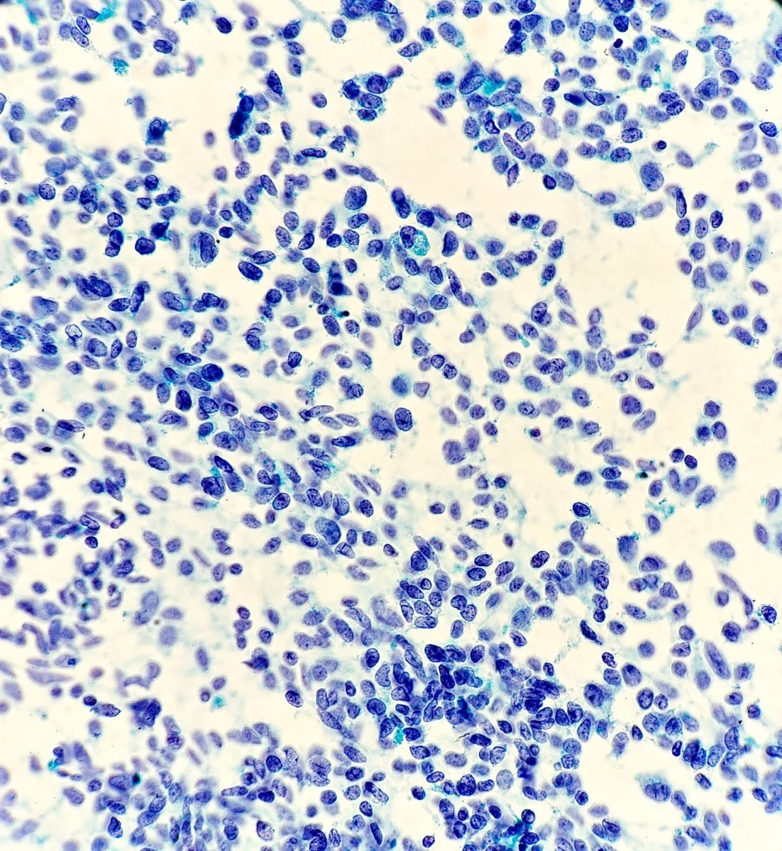 Одиночные разобщенные веретеновидные клетки с зернистым («соль с перцем») хроматином.