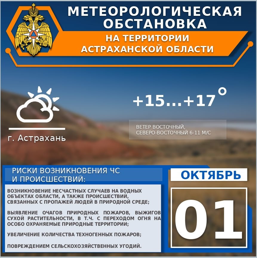 🍂Метеорологическая обстановка на 1 октября На территории небольшая облачность⛅️. Ветер восточный, северо-восточный 6-11 м/с💨. Температура воздуха днем +13...+18°🌡, ночью 0...+5°, местами заморозки до -4°🥶. По г. Астрахань небольшая облачность⛅️. Ветер восточный, северо-восточный 6-11 м/с💨. Температура воздуха днем +15...+17°🌡, ночью +2...+4°. ✅Присоединяйся к МЧС Астрахань 👉Подписывайся на МЧС России в Telegram | MAX