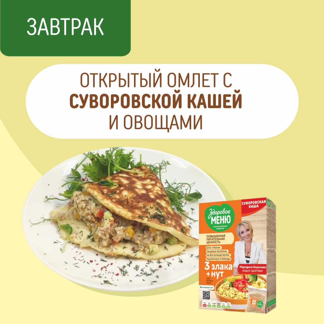 В основе рецептов-функциональные крупы повышенной питательной ценности бренда "Здоровое меню". Завтрак ОТКРЫТЫЙ ОМЛЕТ СУВОРОВСКОЙ КАШЕЙ И ОВОЩАМИ Ингредиенты на 1 порцию: