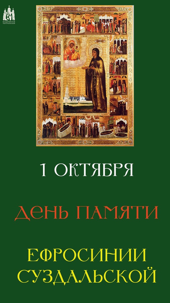 День памяти преподобной Евфросинии (в миру Феоду́лия) Суздальской. ⬆️↗️↘️↖️➡️ Ин тропарь, глас 4 Свята́я твоя па́мять/ Су́ждальскую страну́ весели́т,/ ве́рныя же вся созыва́ет во всечестны́й храм твой,/ иде́же ны́не соверша́ется всесла́вная па́мять твоя́,/ Евфроси́ние преподо́бная,/ моли́ Христа́ Бо́га,// спасти́ся душа́м на́шим. Ин кондак, глас 6 Женише́ мой Сладча́йший,/ Христу́ взыва́ше прекра́сная Евфроси́ния,/ и́бо сла́дость любве́ Твоея́ ду́шу ми наде́жею впери́/ и красота́ ми́лости Твоея́ се́рдце ми услади́,/ сопотруди́тися страда́нии по Тебе́,/ иму́щи на Тя наде́жду,/ да досто́йну мя черто́га с му́дрыми де́вами/ и ликовствова́ти у Тебе́ причти́мся./ Те́мже, преподо́бная,/ почита́юще по́двиг трудо́в твои́х, мо́лим тя́:// моли́ не зазри́тися и нам черто́гу две́ри.