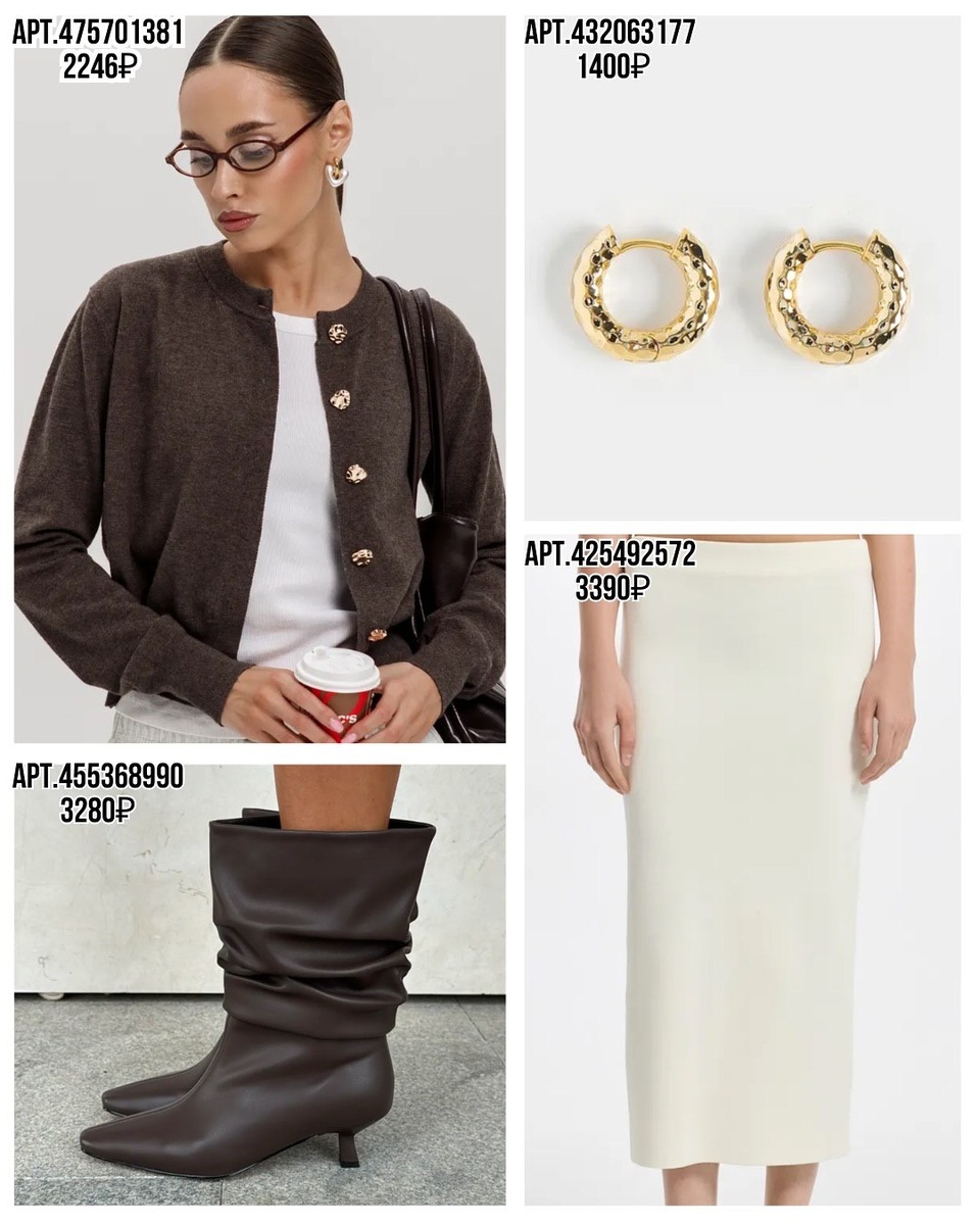 Вкусная палитра, выверенные пропорции и грамотная игра фактур — вот три кита, на которых держится современный гардероб. На фото — три законченных комплекта: интеллигентная классика в кофейно-сливочной гамме, нежная романтика с розовым акцентом и выразительный монохром со вспышками чёрного металла. Ниже — подробный разбор каждой находки строго по артикулам, с нюансами посадки, фактуры и советами стилиста.