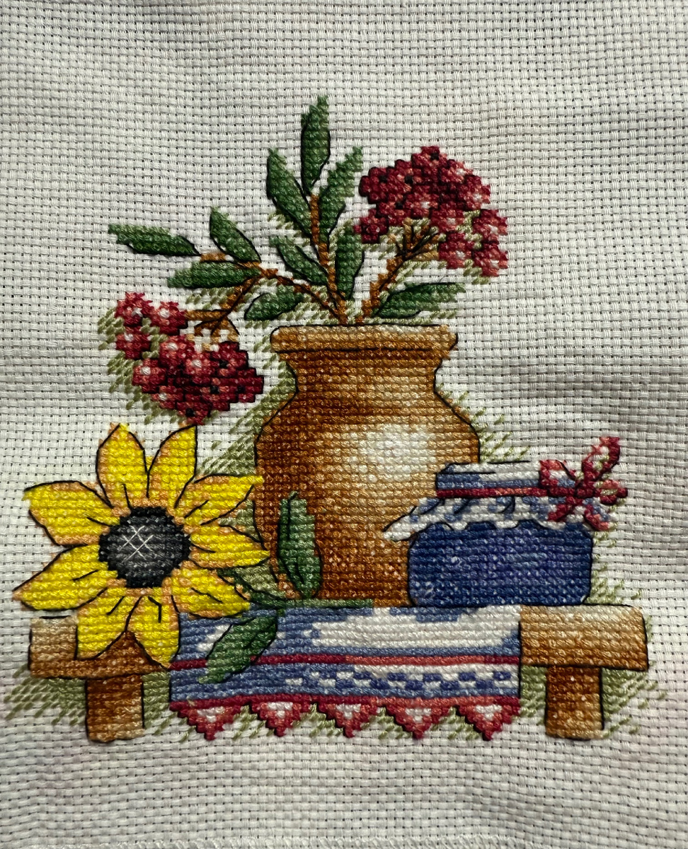 Вот и Сентябрь пролетел. И вместе с завершением первого месяца осени у меня завершился мой дорожный процесс «Дары осени». Вообще производителем этого набора является фирма Панна. Но я вышивала китайскую реплику от Joy Sunday. Честно вышивала я этот набор довольно долго. И долго это было не из - за сложности набора, а именно из-за того что набор лежал у меня в бардачке Жужи и в руки я его брала только когда ждала детей из школы или кружков. Конечно же в машине вышивать не очень удобно, но я приноровилась и мне это даже доставляло удовольствие. Очень хорошо, что канва из китайского набора была с нанесенным рисунком. Берешь ниточку определенного цвета и вперед. При хорошем темпе и имея больше свободного времени этот мини набор можно вышить за два — три дня вообще не напрягаясь. Вообще у Панны эта серия состоит по-моему из четырех наборов (Целебные травы, Дары осени, Цветы в кувшине и Ромашки). У меня из этой серии получается сейчас два вышитых натюрморта. Целебные травы и Дары Осени. Рабо